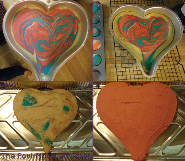 - After the white cake batter has been made, separate it into three bowls and mix in some red and blue food coloring. Then, pour a bit into the heart-shaped pan and swirl that shit about. (TitTip: Don’t swirl it too much or it will be purple, cock-nuts.)