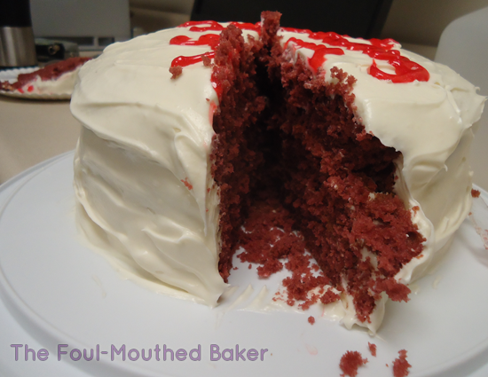 To celebrate my friend’s decision to remain pregnant and shit out a beautiful, baby covered in her vagina particles, I made her a red velvet cake with cream cheese icing.